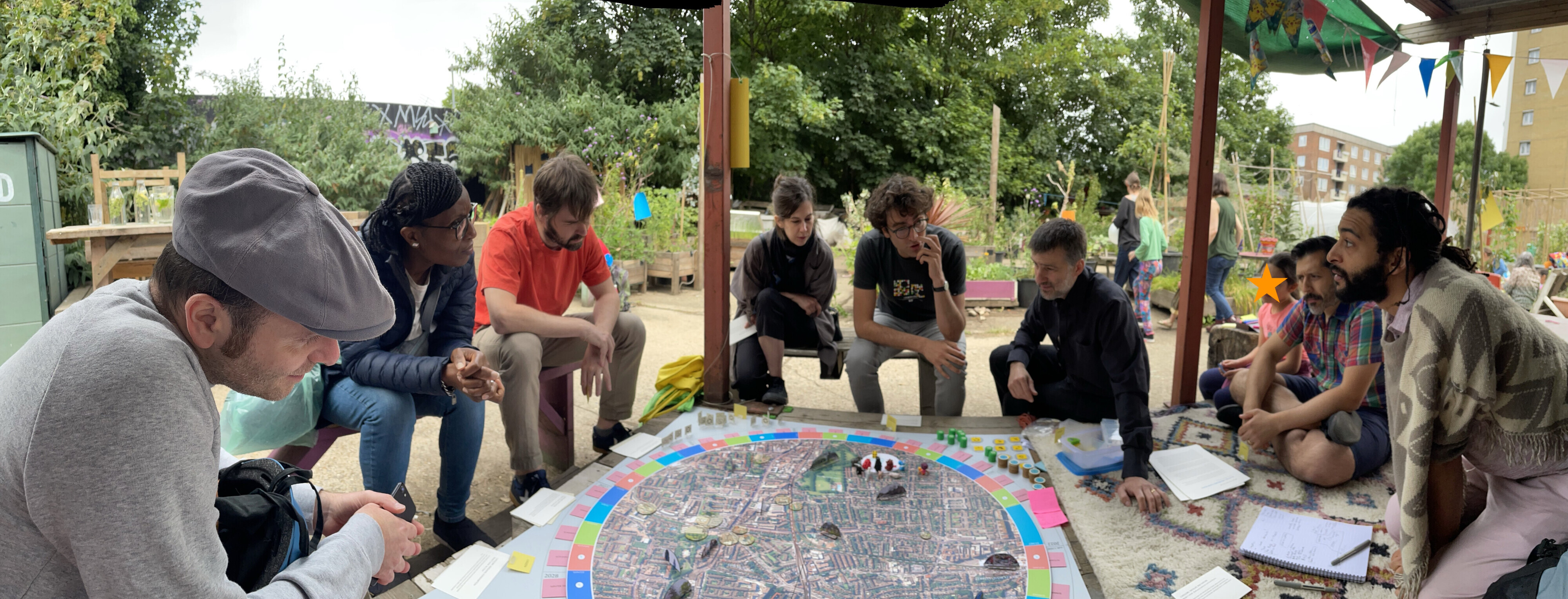 The final workshop took place in an amazing location in Hackney in London called the Garden of Earthly Delights, with a garden community who were very keen about social justice and creating climate education. We used the garden as our place of play and had a demographic of people between around 25 and 55. We actually played on the floor and we just sat around it as though we were sitting around a campfire. There were people actively engaged in sustainable education who were very keen to connect with us in the following stages of the project. So something completely different came out of each workshop.