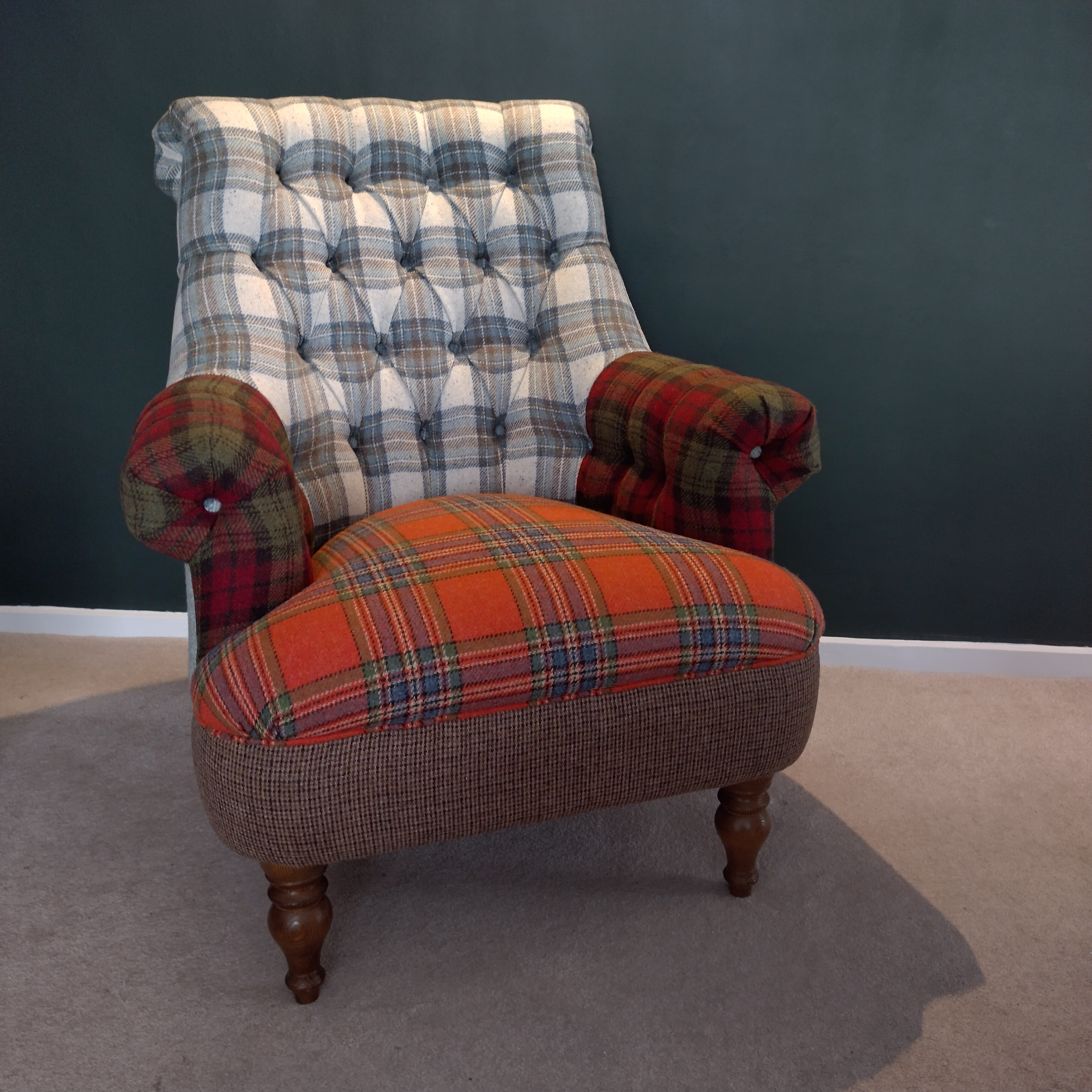 When we started working with the furniture manufacturer, supporting them to improve their sustainability a lot of questions came up around the production process, materials and selling of the products. It is very interesting when a very traditional company, over 100 years old, begins to ask those questions. Our ambition was to understand how we could produce a chair frame through 3D printing using recycled filament from discarded fishing nets collected by Fishy Filaments and use that to close the waste gap in the fishing net industry. The chair frame is then hidden under upholstery, which is where Harris Tweed comes in.