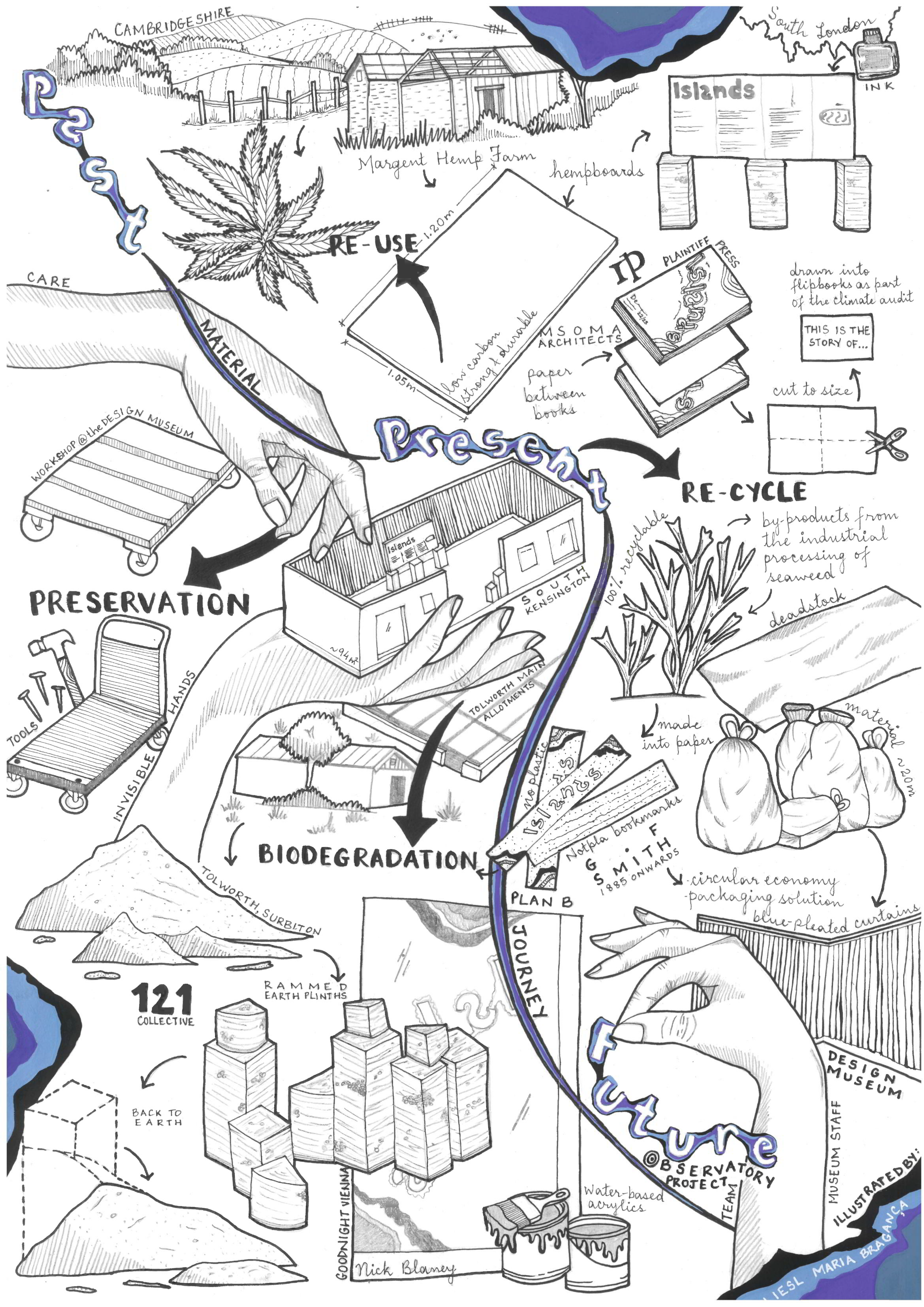 This drawing, completed by Liesl Maria Bragança during a student placement with Future Observatory, maps the stories behind the materials used for Design Researchers in Residence: Islands — a free display at the Design Museum this summer. The drawing highlights some of the environmental questions that influenced the design of the display.