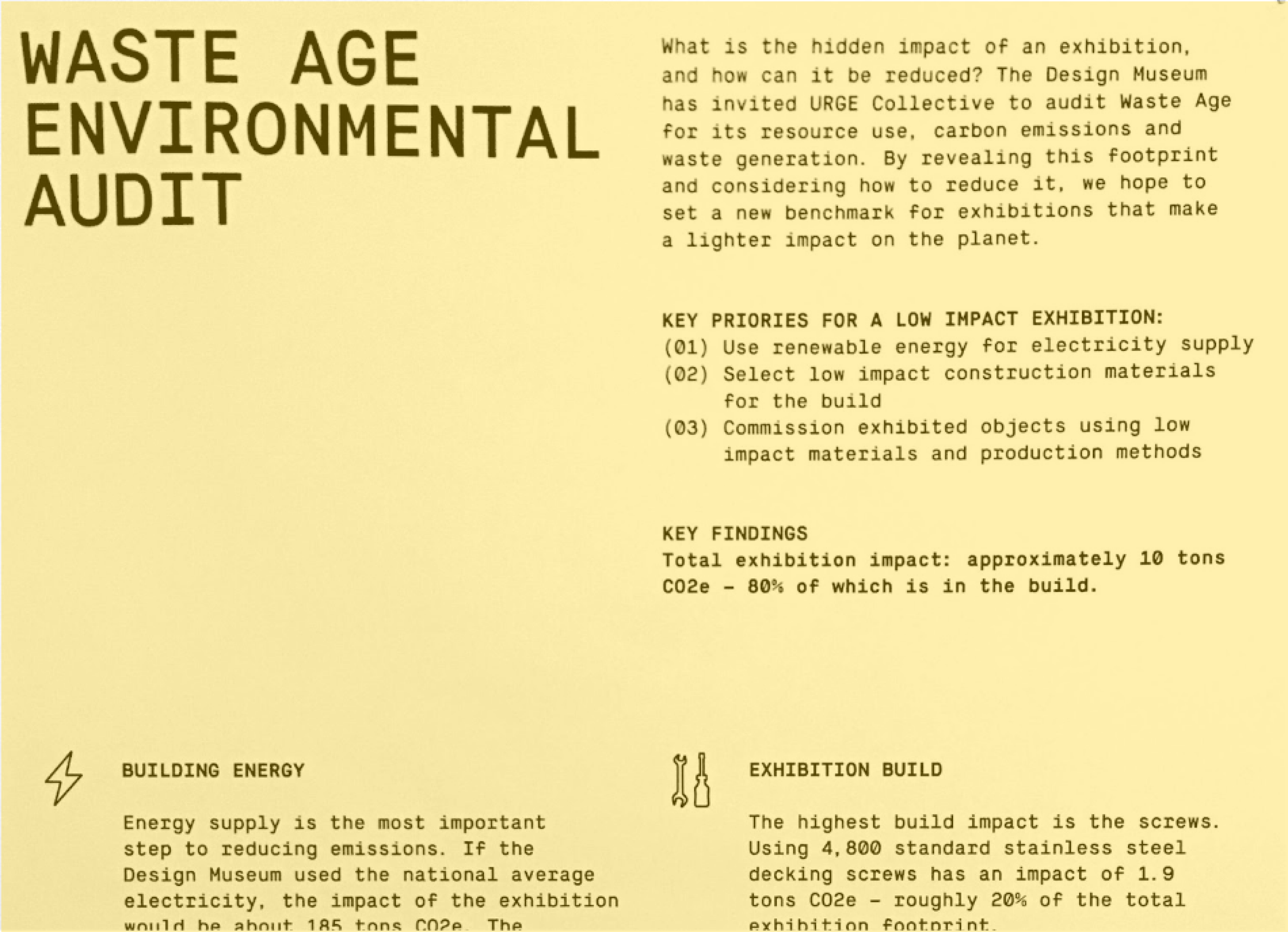 The audit was conducted by URGE Collective’s Alexie Sommer, Ralf Waterfield and Sophie Thomas. It took a Life Cycle Analysis (LCA) approach and required collaboration with the museum’s curatorial, design, facilities and production teams to understand the full extent of the exhibition design process. Not only did the team record the impact of that process, it was also able to help inform and guide design decisions in order to reduce Waste Age’s eventual carbon footprint.Â