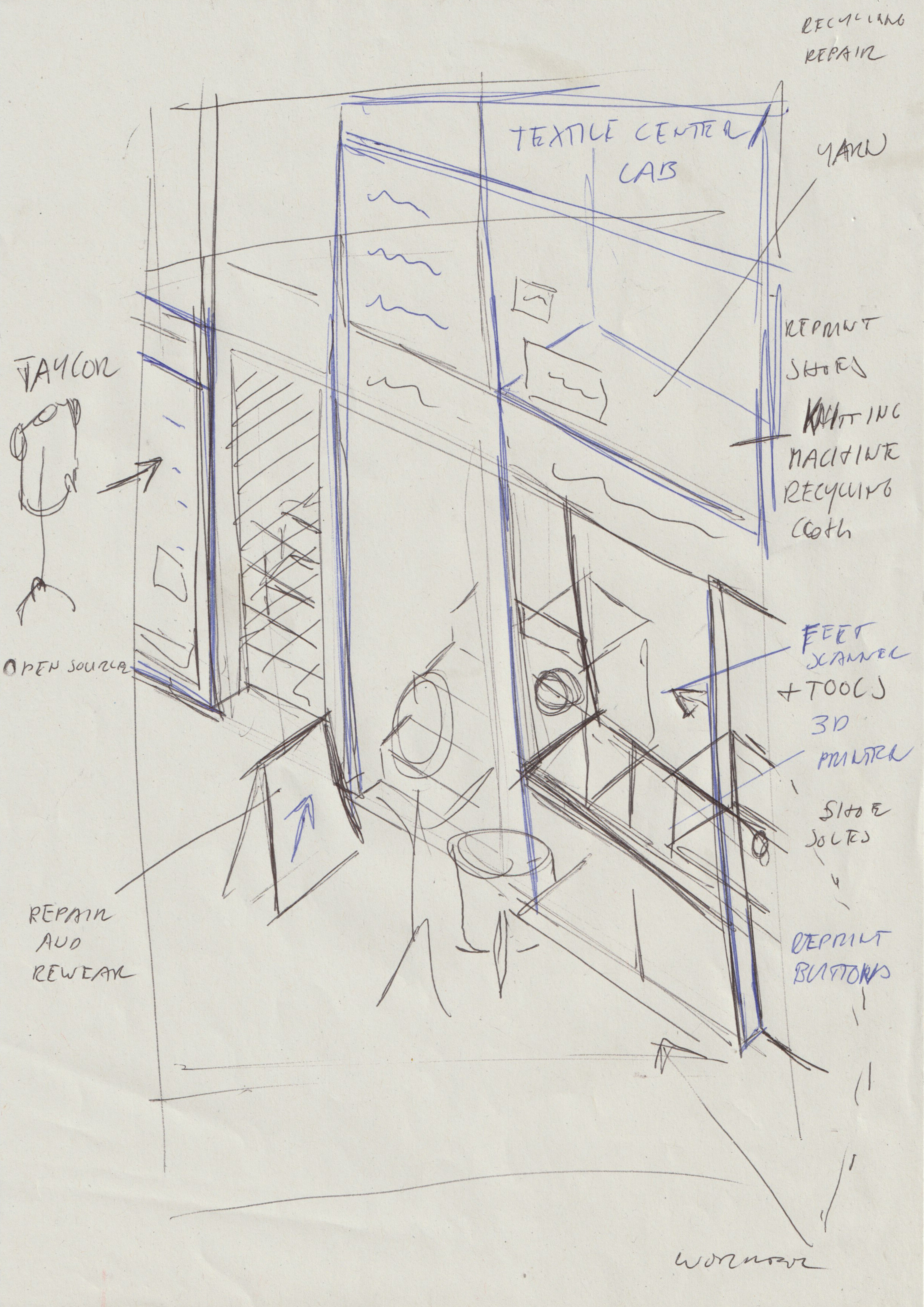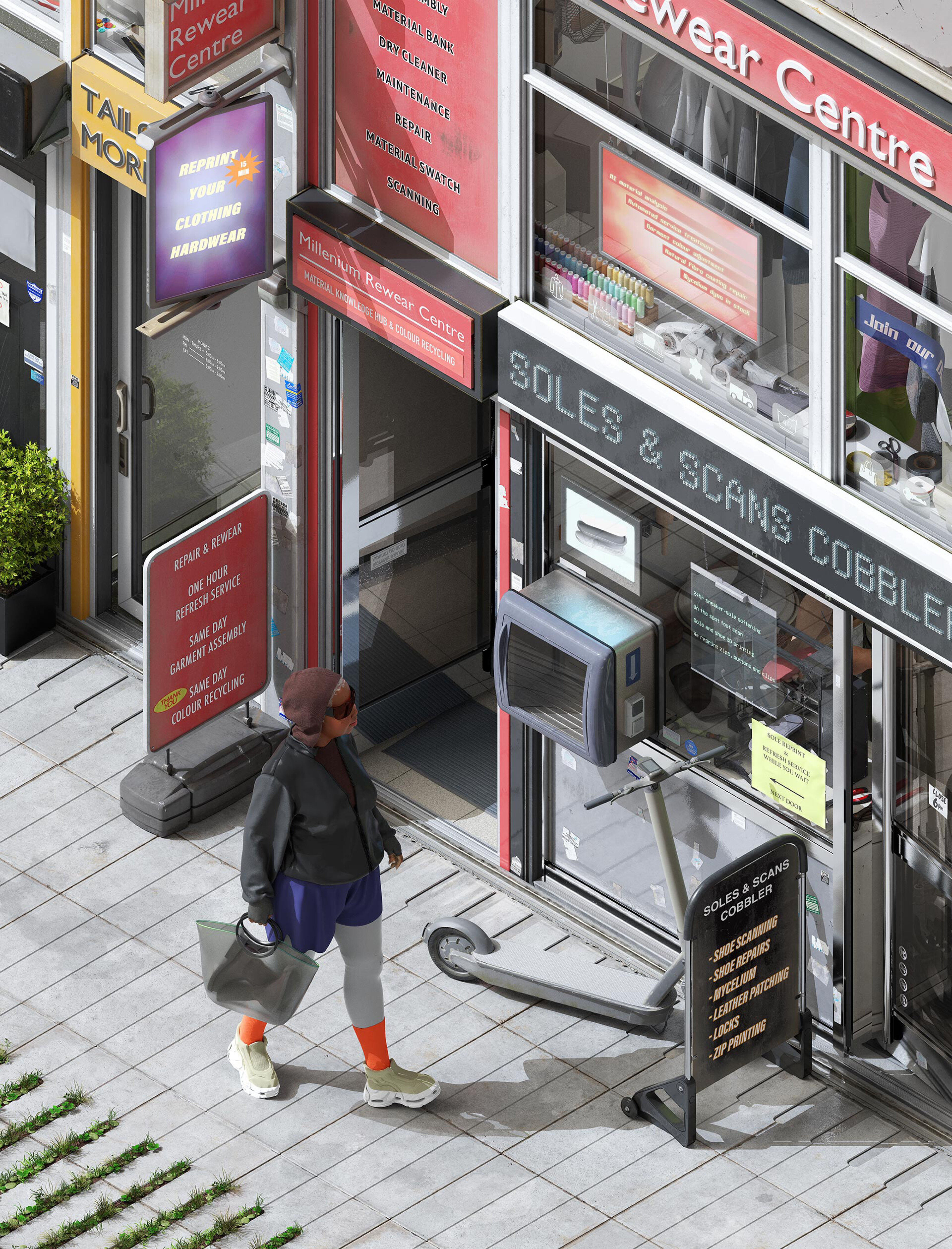 For the final section of the display, Alexa Pollmann was keen to emphasise the role of highstreets in the future of fashion. There already exists a vast network of makers and repair workers across the UK who will be vital in the future of sustainable fashion. Rather than replace those social infrastructures, this third illustration seeks to revalue and augment them with emerging technologies such as 3D printing and scanning.