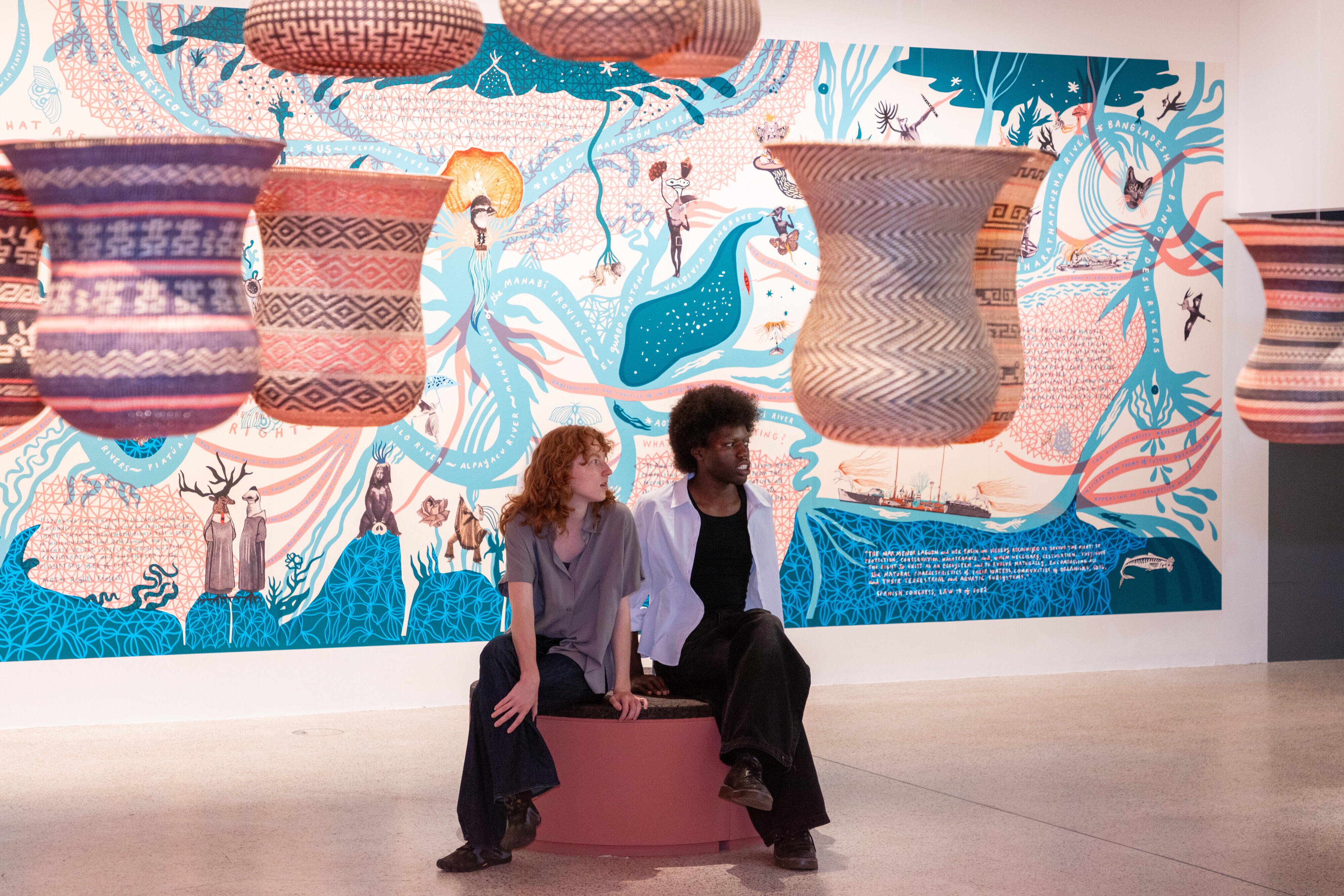 There are more than 50 artists, architects and designers in the exhibition with highlights including artworks for Octopuses by Japanese artist Shimabuku and a brand-new monumental seaweed installation by artist Julia Lohmann created specifically for the exhibition, an organic form that will appear to be growing from the ground of the space. A vast new tapestry that explores the perspectives of pollinators by Alexandra Diasy Ginsberg has been commissioned, as well as a huge 8m mural by MOTH (More Than Human Life Project), depicting the growing movement to award legal rights to waterways around the world. Other new commissions will feature by Paulo Tavares and Feifei Zhou, research fellows supported by Future Observatory.